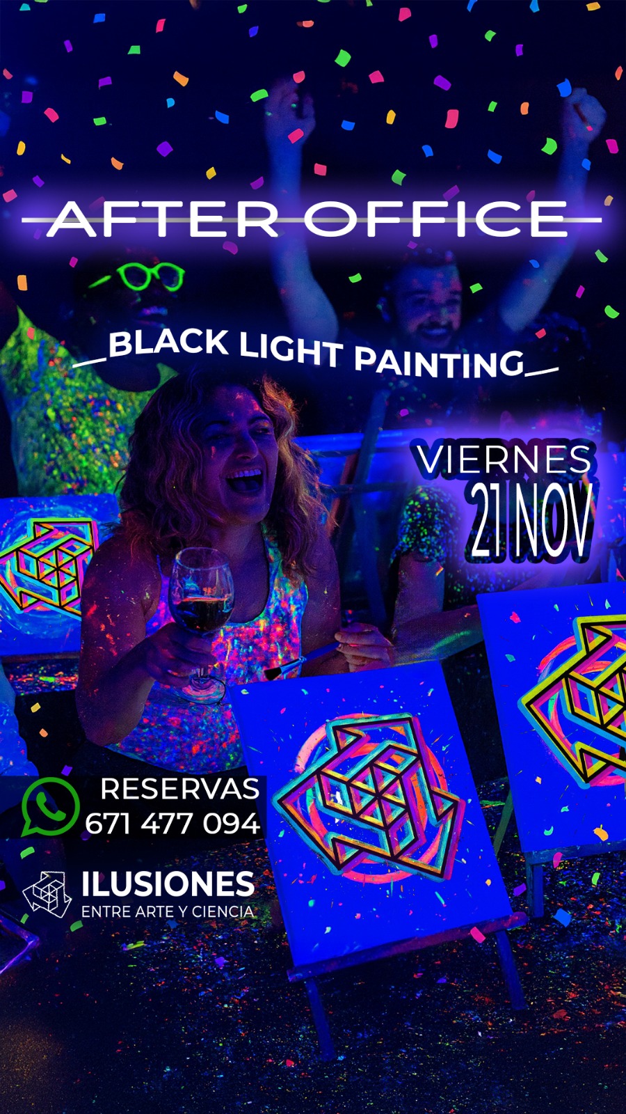 Durante tres horas, los asistentes disfrutarán de un after office diferente, acompañados de vino, picoteo y música, mientras aprenden a crear una pintura fluorescente guiados por un artista o instructor. No se requiere experiencia previa: la propuesta está diseñada para que cualquier persona, sin importar su nivel artístico, pueda expresarse, relajarse y pasar un buen rato en un entorno inspirador.